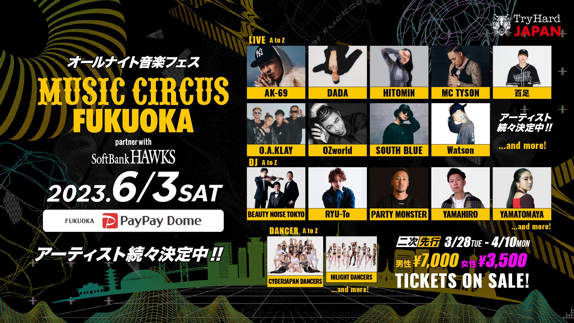 株式会社トライハードジャパン(所在地:大阪市中央区)と福岡ソフトバンクホークス株式会社(所在地:福岡市中央区)は、音楽フェスティバル「MUSIC CIRCUS FUKUOKA partner with SoftBank HAWKS」(以下本公演)の第二弾出演アーティストを発表いたします。