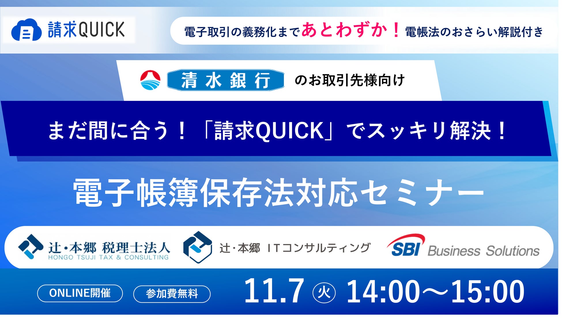 当社はSBIグループが推進する地方創生の取り組みの一環として、多くの地域金融機関と提携し顧客である地域の中小企業向けに、初期費用・月額費用0円から始められるインボイス制度・改正電帳法対応が可能なクラウド型請求書管理システム「請求QUICK」の導入を相互協力のもと推進しております。清水銀行は、「請求QUICKパートナープログラム」にもパートナー企業としてご参加いただき、これまでも多くのお客様に「請求QUICK」をご案内いただいております。このたびの「電子帳簿保存法対応セミナー」は、ITツール活用による地域企業のDX課題の解決に向け、清水銀行、辻・本郷グループ、および当社が相互協力のもと、地域経済の発展を目指す取り組みの一つであり、今後も当社はこうした活動を全国に広げていく予定です。