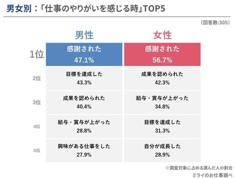 株式会社ネクストレベル(本社所在地:神奈川県横浜市、代表取締役:田中大洋)が運営するミライのお仕事(https://jobseek.ne.jp/)では、働く男女305人に「現在の仕事にやりがいを感じるのはどんな時か」についてアンケートを実施しました。