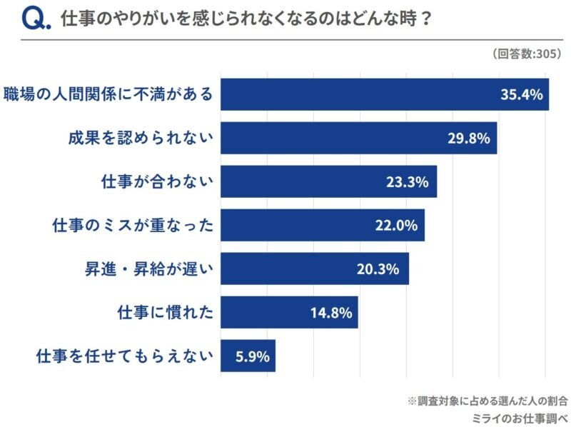 仕事のやりがいを感じられなくなる原因の1位は、「上司や部下、同僚などの職場の人間関係に不満がある時」の35.4%でした。職場の人間関係は、仕事のモチベーションに大きく影響しているようです。