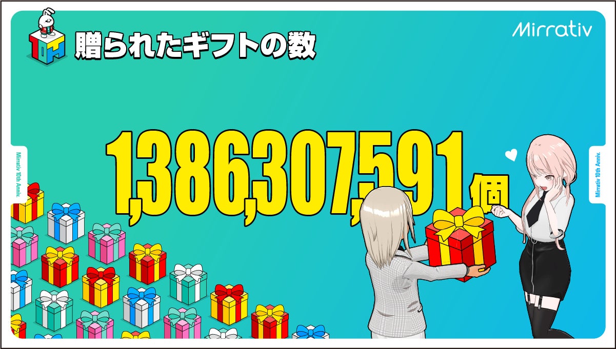2018年、Mirativにギフト機能導入後に、贈られたギフトの数です。13億8,630万個ものギフトが配信者さんに贈られ、配信者さんと視聴者さんとの絆を作ってきました。