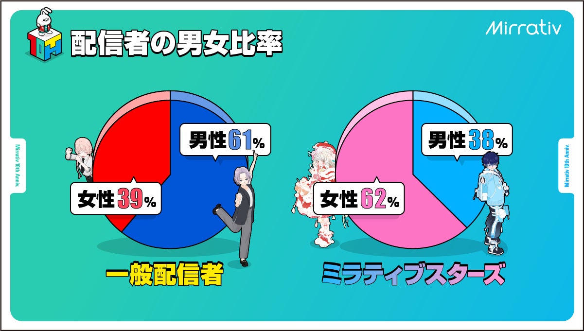 2025年8月時点のMirrativの配信者さんの男女比率です。一般的な配信者さんにおいては男性がやや多く、ミラティブスターズにおいては女性がやや多くなっています。