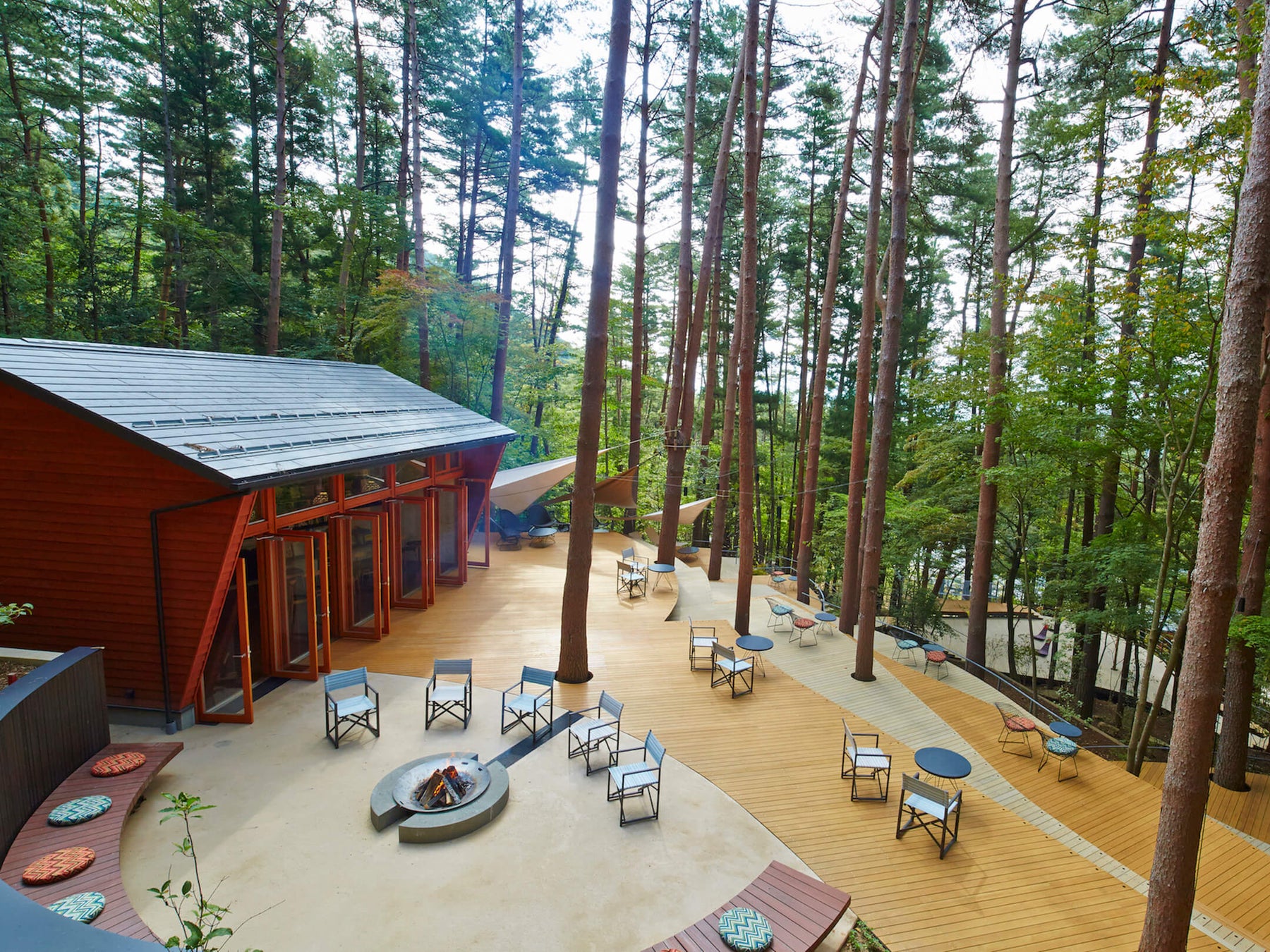 河口湖を望む丘陵に溶け込むように建つ、日本初のグランピングリゾート*。焚き火を眺めながら過ごすひと時、広大な赤松の森の中で愉しめる体験型の食事、自然の中で身体を動かす爽快感。常に屋外で快適に過ごせる環境の中、四季を通して新しい価値を提供します。