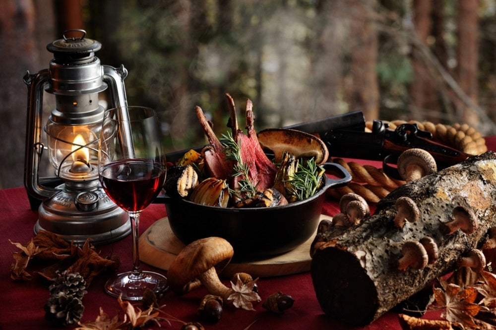 星のや富士で通年提供している「狩猟肉(ジビエ)ディナー」は、屋外の会場で狩猟肉をメインに味わうコース料理です。アウトドアに精通したグランピングマスターと共に、ダッチオーブンを使って仕上げる体験も行います。鹿や猪は森の恵を食べて生活をする為、季節毎の森の変化により食べているものも変わり、肉の味わいも変化します。秋はどんぐりや木の実を食べる為、脂を蓄え1年の中でも特に美味しいと言われる時期です。この時期に提供する狩猟肉ディナーでは、猟師が森に出る際、狩猟をしながら茸を採取して帰るというライフスタイルになぞらえ、狩猟肉と茸を合わせた秋ならではの料理を提供します。動物の命をいただき、食材として美味しく消費するまでの流れを体験することで、狩猟肉への理解がより深まります。