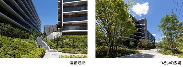ジオ北千里藤白台は、まちびらきから60年を経た千里ニュータウンに位置し、長い年月により成熟した自然環境とコミュニティがありました。そこで本物件では、従前の生活動線の継承と既存コミュニティとの接続のために、敷地内にだれでも通行できる連絡通路を再生させ、その先に地域に開かれた「つどいの広場」を設けました。また、敷地北側・東側にある公園の恵まれた緑と調和する計画とするために、周辺と同じ樹種を多く選定し、敷地の高低差を生かした奥行感のある植栽計画としました。