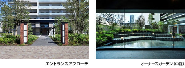 ジオ福島野田The Marksは、「進化する街の新たな風景を誘導しコミュニティを誘発するランドスケープデザイン」をコンセプトとし、彩り豊で季節感ある植栽計画としました。敷地西側の自主管理公園と一体的に整備したエントランスアプローチは沿道に赤レンガ調の門柱を配置し、従前建物である大日本住友製薬の塀の面影を新たなかたちで継承し緑豊かな沿道景観を形成しました。また、エントランスホールと繋がるオーナーズガーデン(中庭)には水盤を配置し落ち着きと高級感ある演出を行いました。レストスペースにはオガタマノキやジンチョウゲ等を配置し、緑と共に香りを感じる憩いの時を演出しています。