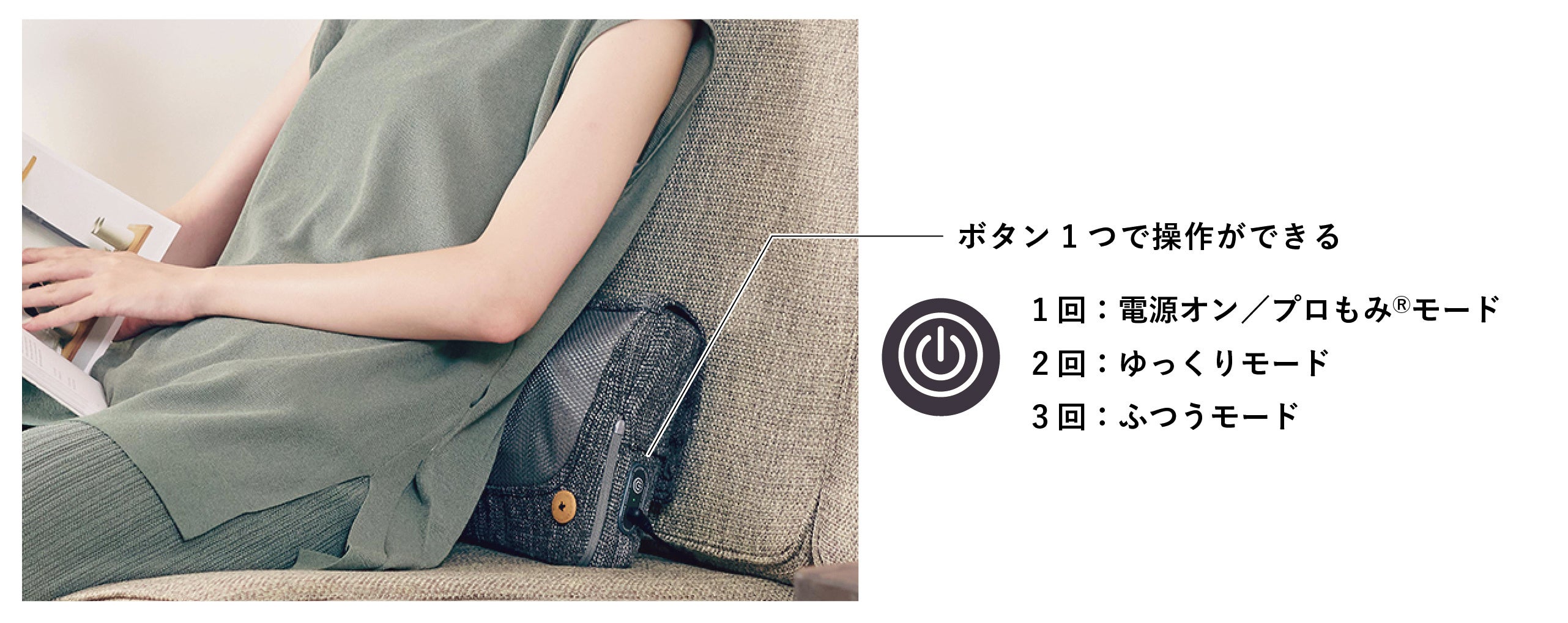 本製品には当社マッサージクッションの上位機種に搭載している、3段階のもみ速度モード「プロもみ®」「ゆっくり」「ふつう」を採用しています。今回の評価では、1万円以下で速度調節ができる点が高く評価されました。また、速度を遅くすることでじっくりと気持ちいいポイントを見つけやすく、もみ心地(刺激の強さ、もみ玉の動き)の高評価にもつながりました。