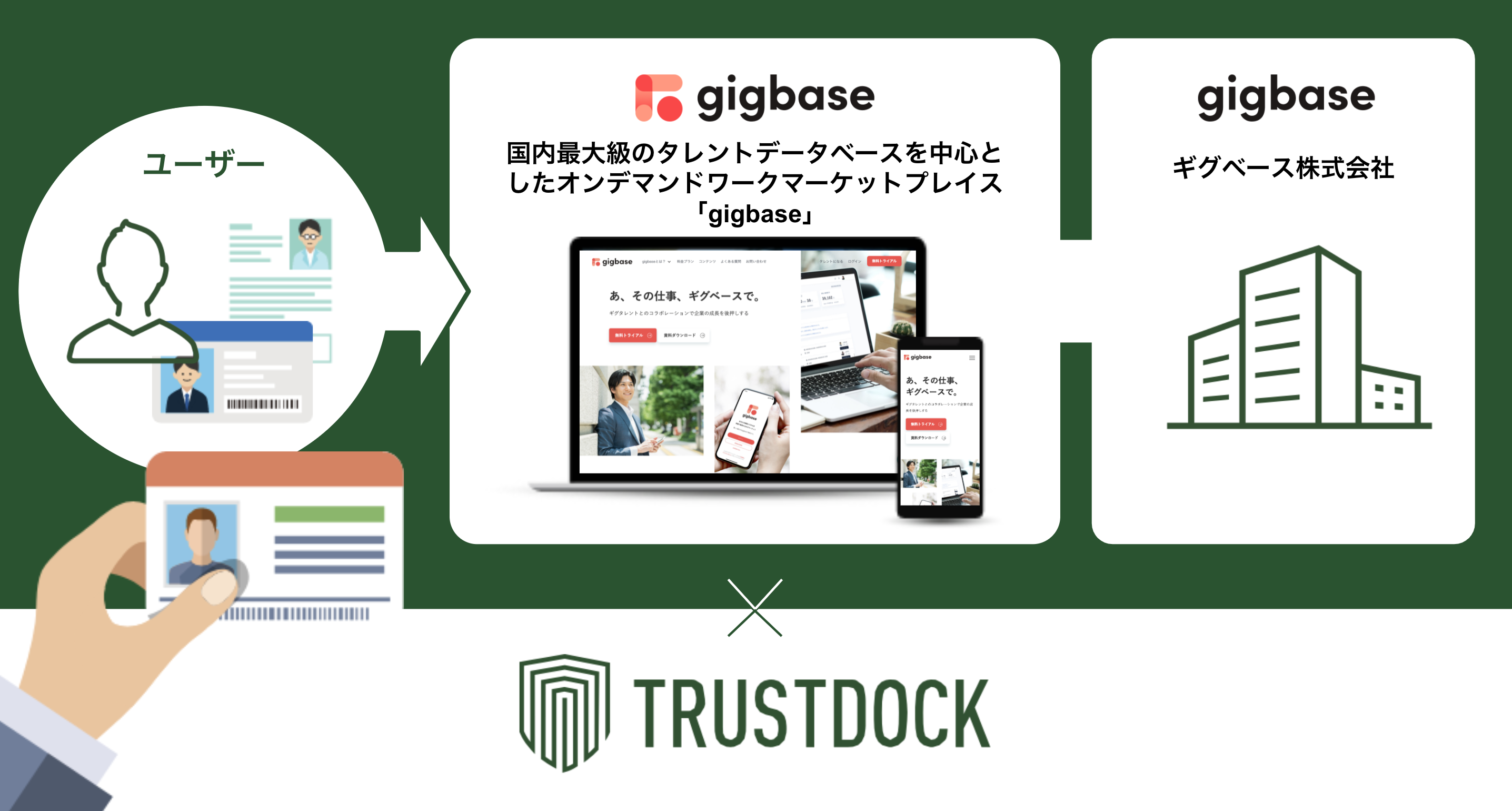 導入社数No.1(※)のオンライン本人確認/eKYCを提供する株式会社TRUSTDOCK(本社:東京都千代田区、代表取締役:千葉 孝浩、以下 TRUSTDOCK)とギグベース株式会社(本社:東京都千代田区、代表取締役:田中 祥司、以下 ギグベース)は、本人確認業務の代行において業務提携することに合意し、ギグベースが展開する、国内最大級のタレントデータベースを活用したオンデマンドワークマーケットプレイス「gigbase」に、本人確認APIの導入実施を完了したことをご報告します。