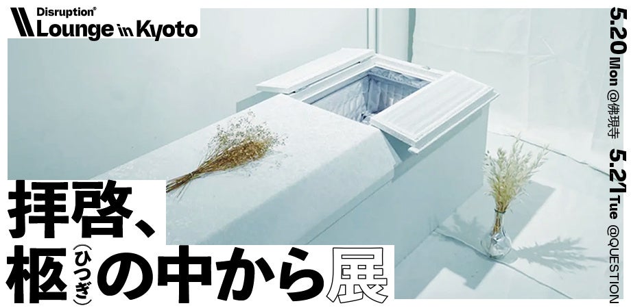 このような生活者の価値観の変化を受けて、今回の「Disruption® Lounge」~終わりのはじめかた~ では、死・終わり・撤退などの“終わり”に寄り添ってきた株式会社むじょう、そして、生活者にとって難しいと感じる仏教の教えをより親しみを感じてもらう取り組みを行っている佛現寺、さらに、京都で人・事業・地域をつなぐ取り組みを行っている京都信用金庫との共創より実施に至りました。本イベントでは、世の中でタブーとされてきた「終わり」について向き合い、「『終わりのはじめかた』について考える」をテーマに展示会「拝啓、柩(ひつぎ)の中から展」を5月20日(月)と21日(火)の2日間にわたり開催します。さらに、21日(火)には、本イベントを共創するパートナーである株式会社むじょう 代表取締役 前田 陽汰氏と、佛現寺 副住職 油小路 和貴氏を迎え、京都信用金庫が運営する共創施設「Question」にてトークセッションを行います。