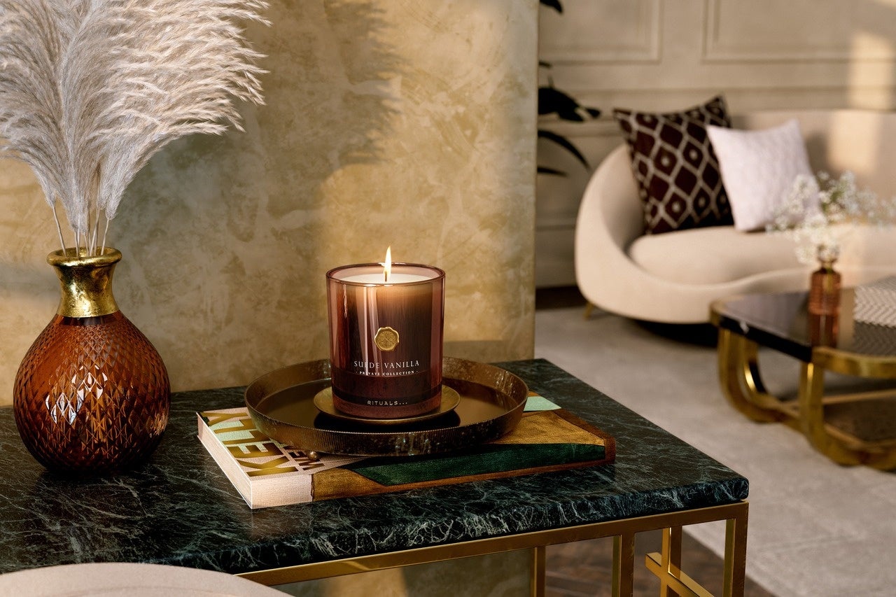 優しげな香りが心をほどき、安らぎをもたらすスエード バニラのラグジュアリーなアロマキャンドル