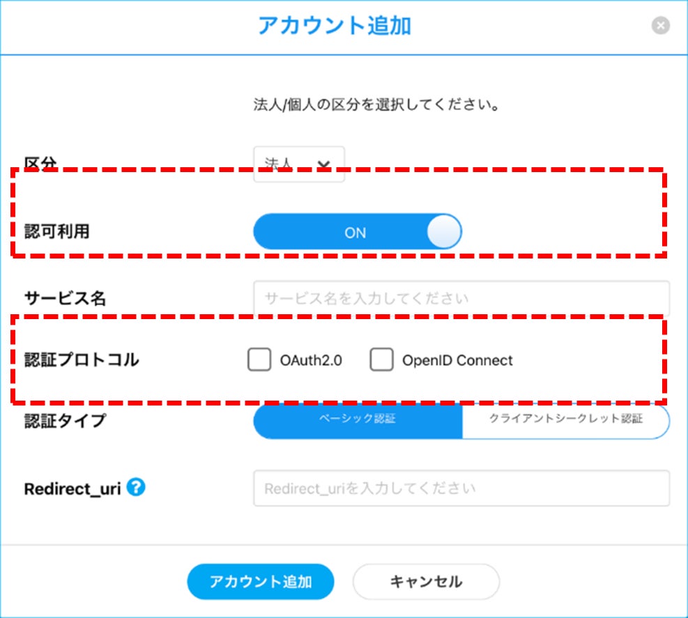 認証プロトコルは「OAuth2.0」と「OpenID Connect」(*2)が選択できます。認証タイプは「ベーシック認証」と「クライアントシークレット認証」のいずれかを選択できます。
