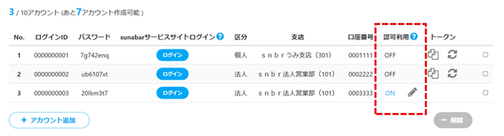 「API認可機能」の設定状況の確認は、アカウント一覧にて、認可利用の状態を確認可能です。