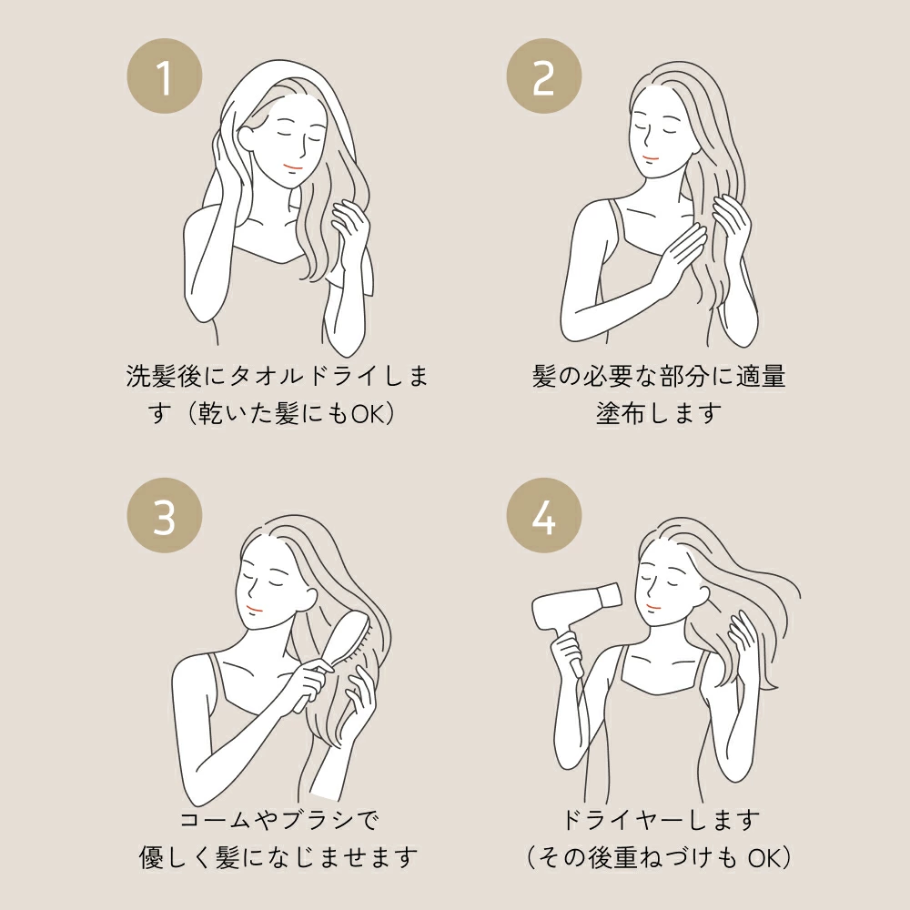 朝:乾いた髪×ドライヤー前のヘアオイルとして使用。ツヤとまとまりをキープ。