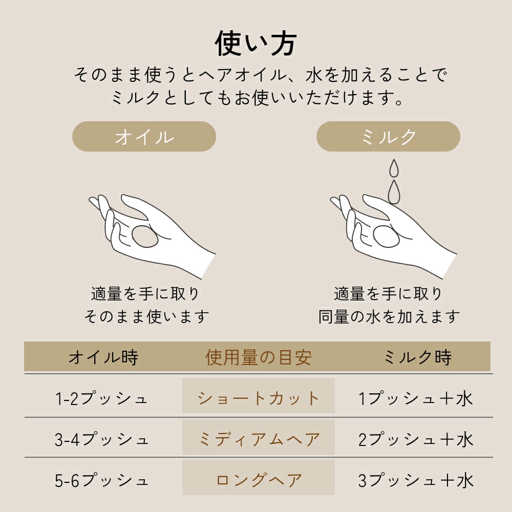 髪の仕上がりを自在に選べる新体験!手のひらに取ったオイルに少量の水を加えるだけで、ベタつきのない軽やかなヘアミルクへとテクスチャーが瞬時に変化します。