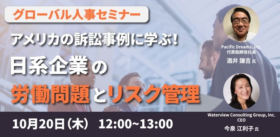 本セミナーは、ご好評いただいた過去4回のセミナーに引き続き、アメリカで日系企業向けの人事コンサルなど展開、現地のリアルな現状をよく把握されているPacific Dream社 酒井 謙吉 氏、Waterview社 今泉 江利子 氏にご登壇いただきます。