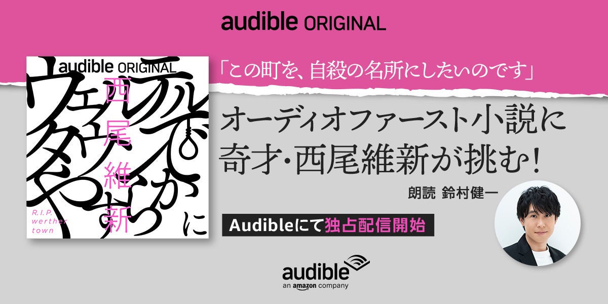 世界最大級のオーディオブックおよび音声コンテンツ制作・配信サービスであるAmazonオーディブル(以下、Audible)は、12月29日より西尾維新さんの新作書き下ろし長編『ウェルテルタウンでやすらかに R.I.P. werther town』を配信します。本作の朗読を務めるのは、数多くのアニメやゲーム、吹き替え等で幅広く活躍する声優、鈴村健一さんです。