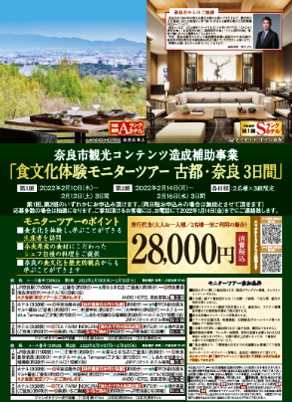奈良市の「食産品」「食文化」をテーマに、各専門家を交えて関わる市内事業者と一体的にガストロノミーツーリズムを再構築すると共に、旅マエ戦略事業「たびコト塾」の開催、旅ナカ戦略事業「モニターツアー」の開催を行う。