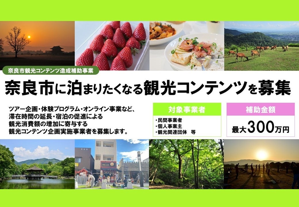 奈良市の観光については、滞在時間の延長・宿泊の促進が課題でした。この課題を解消し観光消費額の増加を目的とし、令和3年10月に奈良市観光コンテンツ造成補助事業として、企画実施事業者を募集したところ、審査の結果12事業者が決定しました。事業者から課題解消に向け新しい視点から様々な企画の提案があり、今後、各観光コンテンツが実施されます。