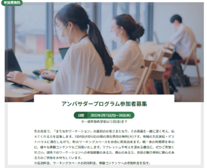 「奈良で働き暮らす」をコンセプトにした、滞在型のワーケーション事業を奈良市内にてスタート。宿泊施設への滞在・ワーキングスペースの利用にとどまらない、この土地ならではの体験コンテンツを創造する。まず「ワーケーション」に対する受入側地域の理解を促進するために、地元企業や事業者を対象としたトークイベントの開催。並行してワーケーションを体験し発信するアンバサダープログラムを実施する。