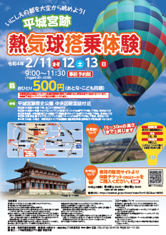 平城宮跡歴史公園で熱気球を飛ばし、かつて京のあった平城宮を上空から見下ろし、旅行客や地元住民にその光景を体感してもらう。平城宮跡歴史公園で熱気球を係留飛行させ、かつて都の中心であった平城宮跡を上空から眺める事ができる体験です。旅行客の皆さまや周辺にお住いの皆さまはその光景を是非体感してください。