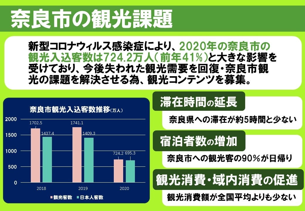 コロナウイルス感染症により、本市の観光産業は大きな影響を受けており、今後、失われた観光需要を回復していくためには、新しい生活様式に対応した安全・安心な奈良旅のスタイルの普及・定着とともに、変化する観光客のニーズに合わせ、本市の持つ多様な歴史・文化という大きな魅力をより一層磨き上げていく必要があります。