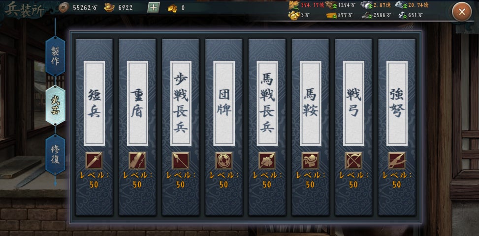 兵装所の兵器機能が全面的にリニューアルされ、「耐久」「修復」「武芸レベル」などの新要素が追加されます。