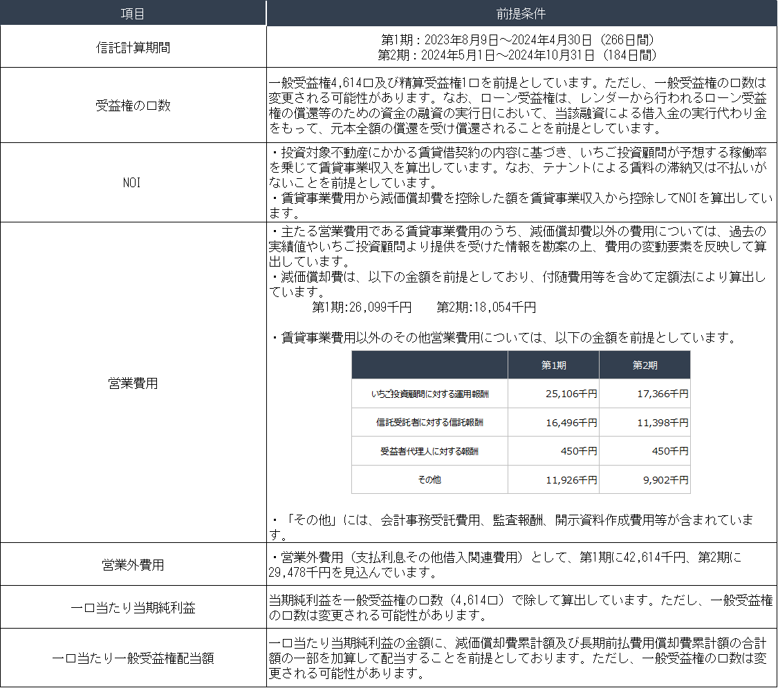 本資料に記載されている予想数値は、一定の前提条件のもとに算出した現時点の見込額であり、今後の賃料収入の変動、予期せぬ修繕の発生等運用環境の変化、または金利の変動等状況の変化により、前提条件との間に差異が生じ、その結果、当期純利益および1口当たり一般受益権配当額を含む予想数値は変動する可能性があります。本資料は、その金額を保証するものではありません。(金額については、単位未満の数値を切り捨てて表示しています。)