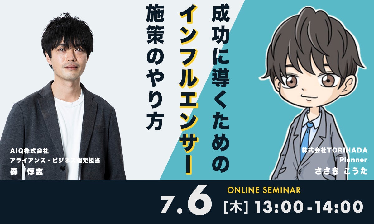 "私の「本当の好き」が、あなたの「価値」に変わる社会"を目指すAIQ(アイキュー)株式会社(本社:東京都文京区、代表取締役社長CEO兼COO 渡辺求)は、株式会社TORIHADA(本社:東京都渋谷区、代表取締役社長:若井映亮)との共催オンラインセミナー『成功に導くためのインフルエンサー施策のやり方』において当社アライアンス・ビジネス開発担当の森が登壇することをお知らせします。