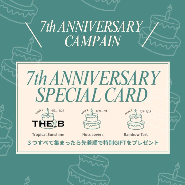 7周年限定商品販売期間中 6月21日(土)〜 7月11日(金)に3種類すべてのアサイーボウルをお召しあがりいただき、スタンプを獲得された方には、THE_Bからスペシャルギフトをプレゼント!!是非ご参加くださいませ。