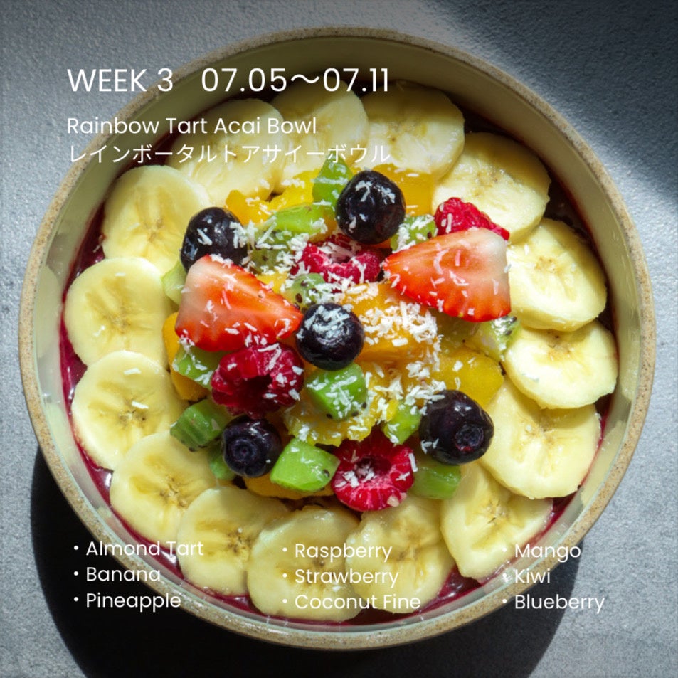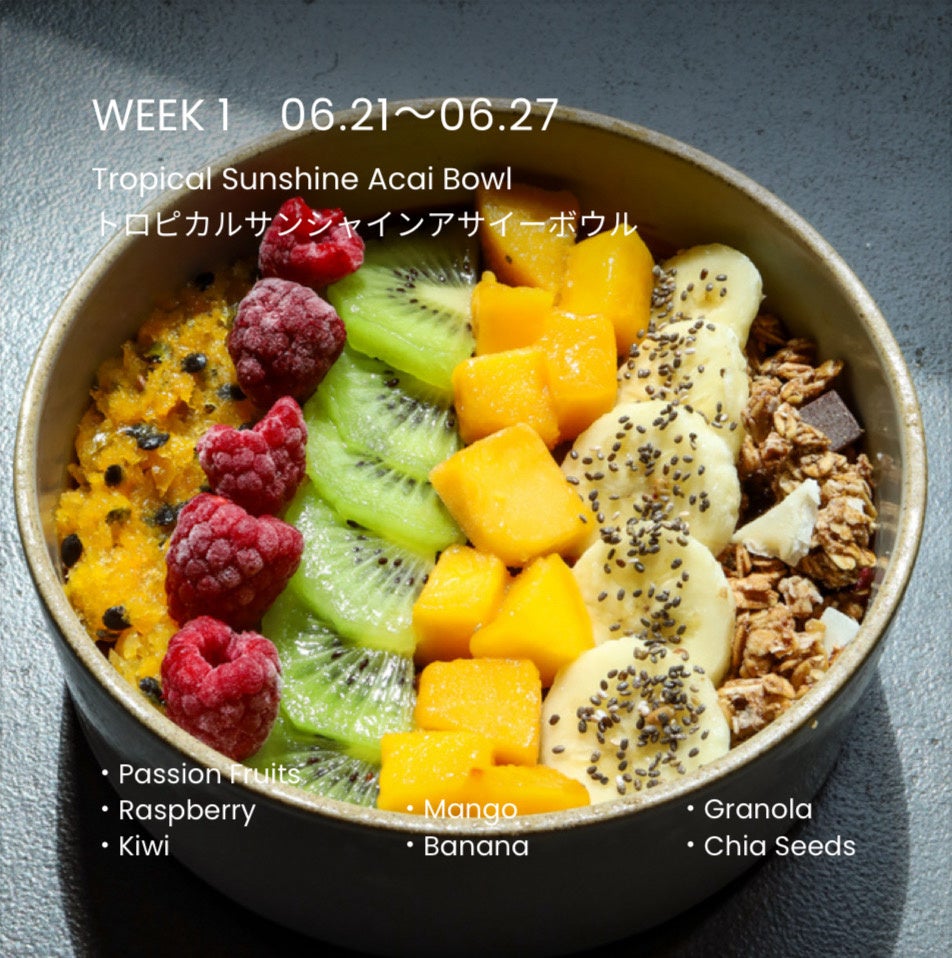 「夏気分を盛り上げる、ビタミンたっぷりの一杯」をテーマに、パッションフルーツ・マンゴー・キウイなど南国フルーツを贅沢にトッピング。爽やかな酸味と香りで、ひと口食べるだけでトロピカルな気分が一気に広がります。ビタミンEやβカロテンもたっぷりで、食べながら紫外線ケアも叶う、この季節にぴったりなフルーツボウル!