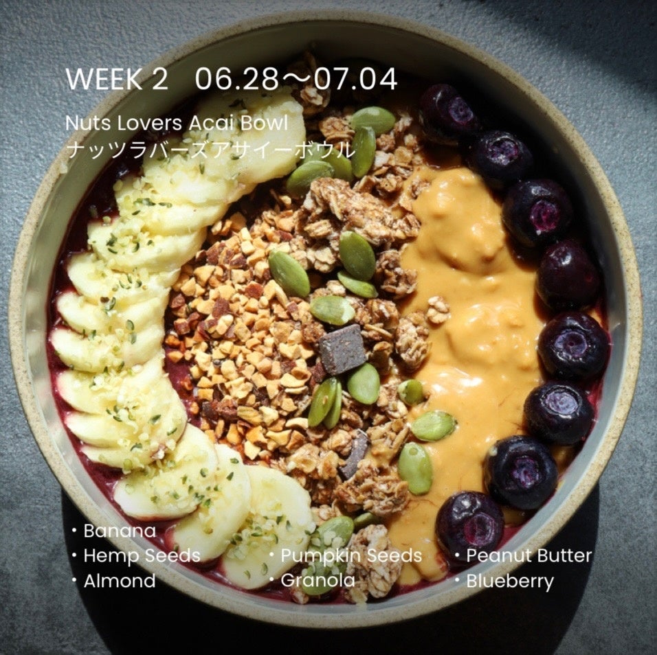 たっぷりのピーナッツバターと4種のナッツ&シードで香ばしさをMAXに仕上げた"濃厚ナッティー"なアサイーボウル。主役のピーナッツバターのクリーミーさと、さっぱりしたアサイーは相性抜群!ビタミンE、亜鉛、マグネシウムが集中力アップをもたらし、栄養満点な一品です。