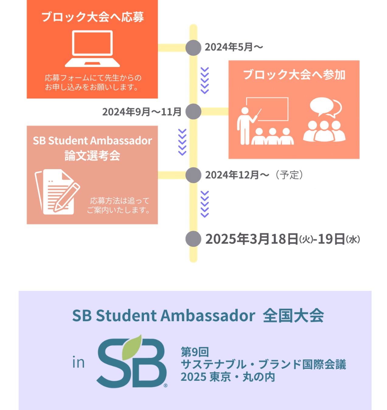 なお、Student Ambassadorとして3月に開催する「サステナブル・ブランド国際会議 2025 東京・丸の内」に出席するためには、こちらの「第5回 SB Student Ambassador ブロック大会」へ参加後、論文選考会を経て本大会に出場していただく必要があります。