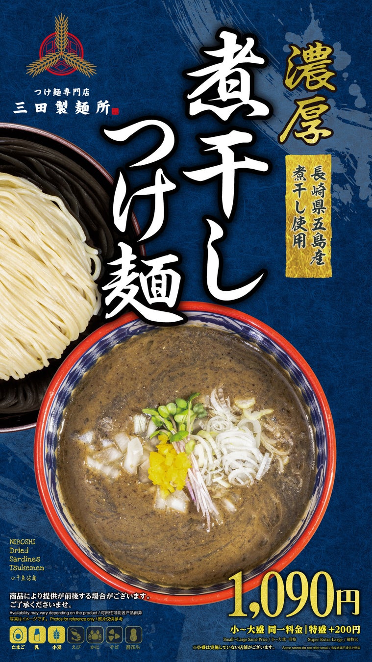 長崎県・五島列島産の煮干しを贅沢に使用したドロリと濃厚な特製ダレ。三田製麺所つるっとコシのある麺にたっぷりと絡めて、長崎の豊かな海の恵みをお楽しみください!!!