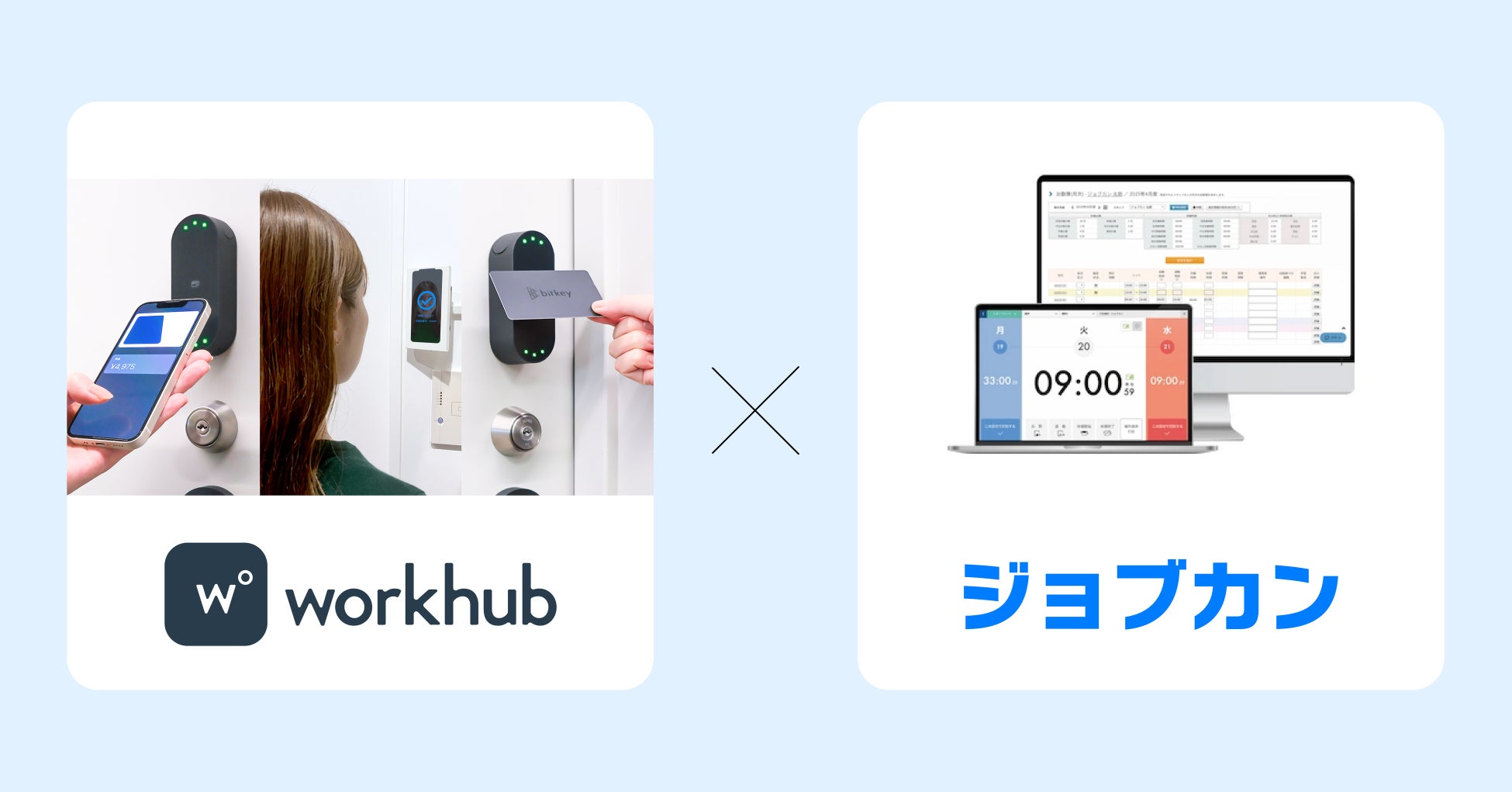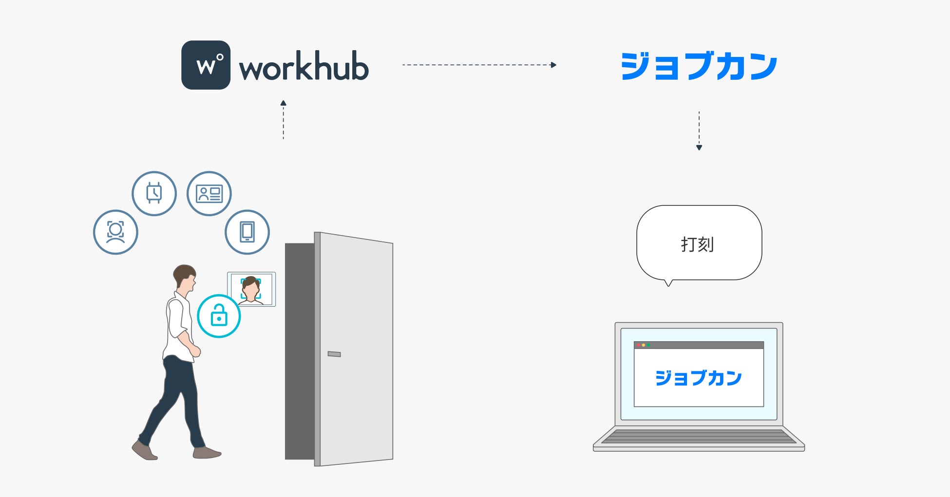 株式会社ビットキー(本社:東京都中央区、代表取締役社長 CEO:寳槻 昌則、以下「ビットキー」)は、ビットキーが提供するコネクトプラットフォーム「workhub」と、株式会社DONUTS(本社:東京都渋谷区、代表取締役:西村 啓成、以下「DONUTS」)が提供するクラウド型の勤怠管理システム「ジョブカン勤怠管理」との連携を開始することをお知らせいたします。これにより、「workhub」がスマートロックなどのスマートアクセス製品群※1から取得した入退室履歴を、ジョブカン勤怠管理へ自動で連携することが可能となり、出退勤時の打刻の手間をなくし、客観的な労働時間の把握が可能になります。