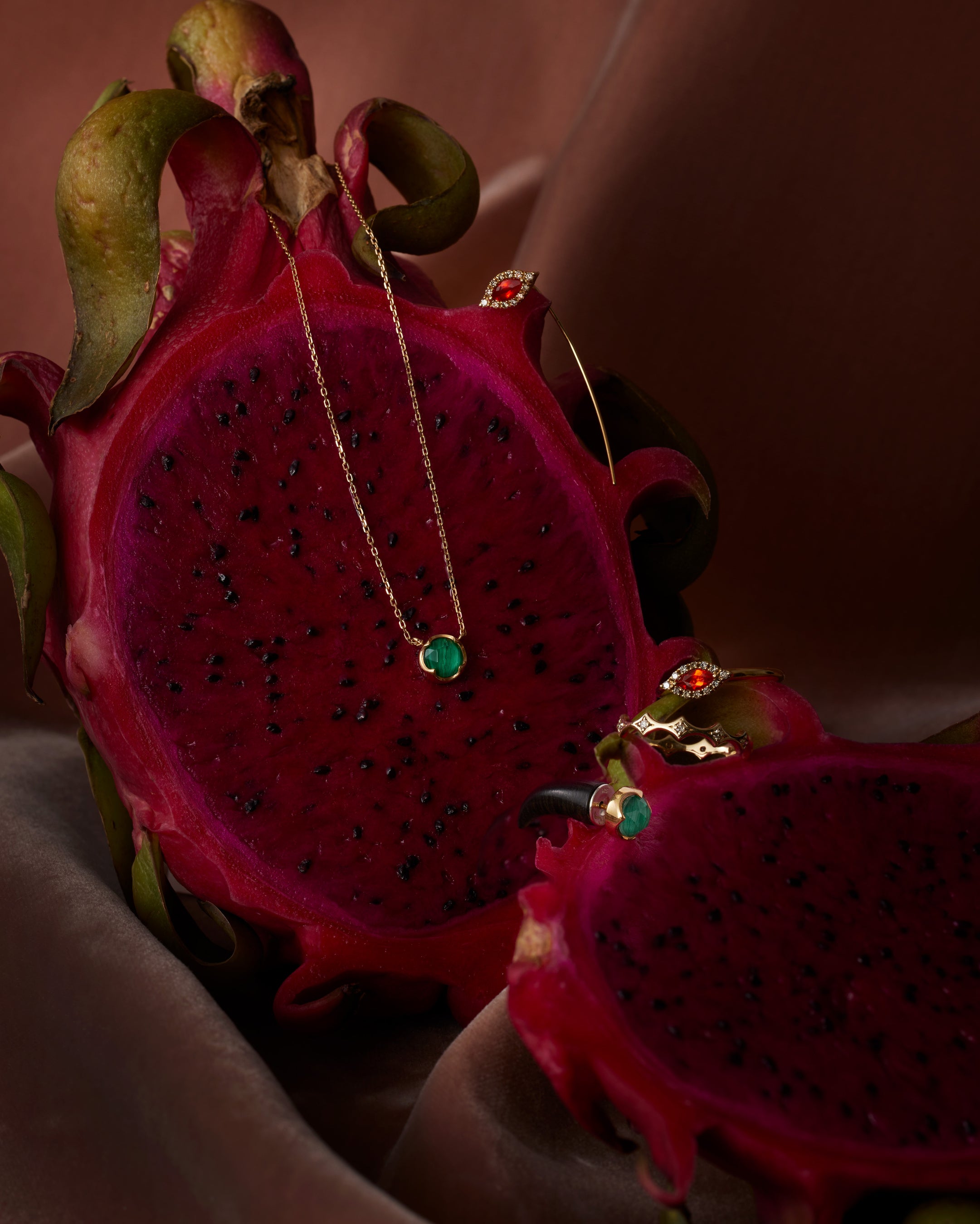 今季のキーカラーであるグリーンをテーマに、マラカイトとクォーツを重ね合わせたダブレットストーンを、薔薇のつぼみを意味する瑞々しいローズカットで仕立てました。
