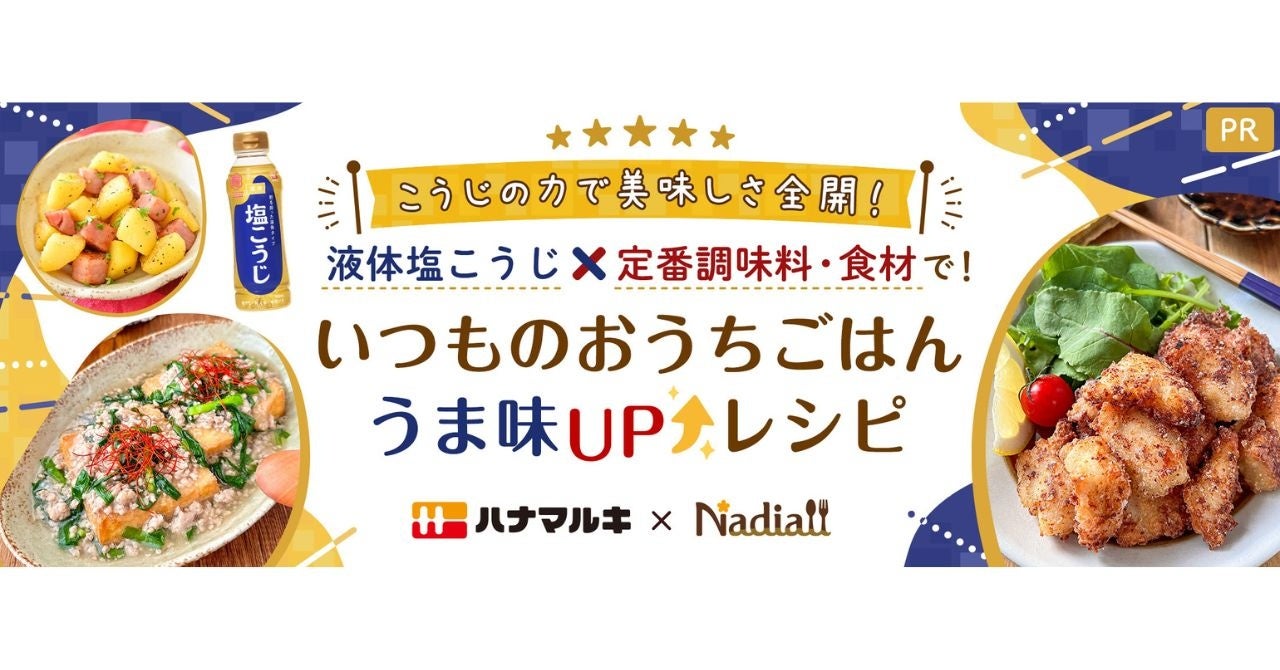 Nadia株式会社(東京都港区/代表取締役社長 葛城嘉紀 以下「Nadia」)とハナマルキ株式会社(長野県伊那市/代表取締役社長 花岡周一郎 以下「ハナマルキ」)がタイアップし、「液体塩こうじ」の消費拡大を目的に、特別企画ページ【いつものおうちごはん うま味UPレシピ】を2024年12月から約半年にわたって毎月更新いたします。