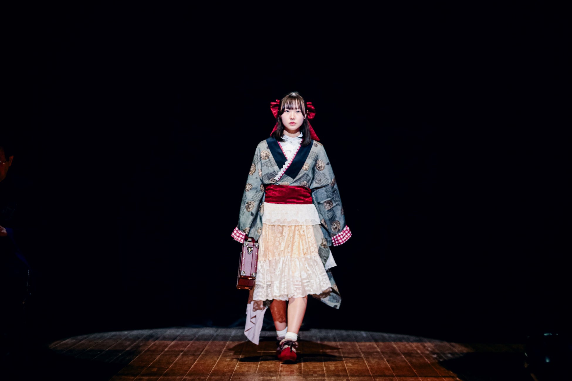 「テーマは『和と洋の融合』。和の要素を多めにしつつ、洋の要素はワンピースとして取り入れました。事前にaxes femmeの店舗で年配のお客様に“どんな服があったら嬉しいですか”と聞いたときに、『年配でも着られる可愛い服があれば』と言われたのが印象に残っていて、色味や柄を工夫しました。二次元で描いたデザインが、こんなに美しい服になっていて感謝の気持ちでいっぱいです」