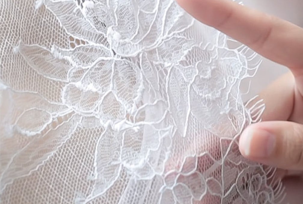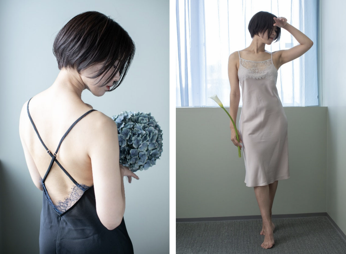 また、生熊氏はスリップにあしらわれているレースにこだわりました。写真家として撮影する際に、レースの透明感や、光に当たって作り出す影の美しさに魅了されてきた経験から、今回膨大な数のレースのサンプルの中で、納得する素材を選りすぐりました。