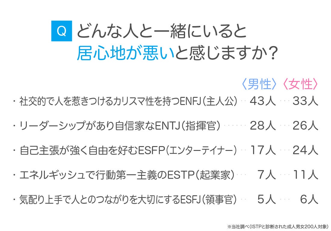 ISTP(巨匠)と診断された成人男女200人に、どんな人と一緒にいると居心地が悪いか尋ねたところ、「社交的で人を惹きつけるカリスマ性を持つENFJ(主人公)」が最多でした。