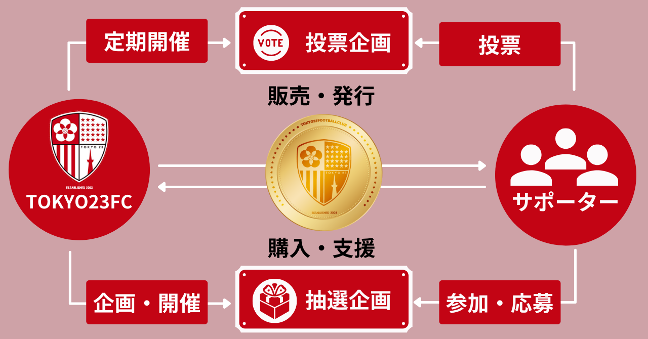 TOKYO23FCトークンはクラブへの応援の「しるし」や「証」の役割を果たし、また単に支援の証になるだけでなく、保有することでクラブ発の投票企画への参加や、トークン保有者限定の特典への応募ができるなど、新しい体験ができるデジタル上のアイテムです。