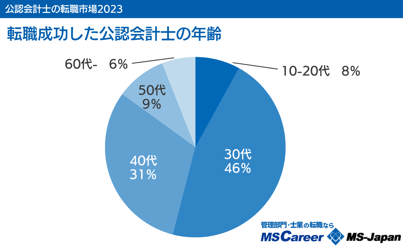 転職に成功した公認会計士の平均年齢は40.9歳で、最も多かったのは30代で全体の46%と半数近くを占める結果となりました。