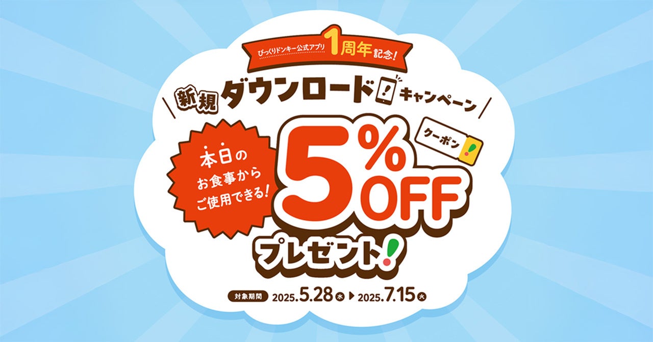 ・参加方法:キャンペーン期間中に公式アプリを新規ダウンロードいただくと、その日から使える店舗限定 お食事5%割引クーポンがもらえます。