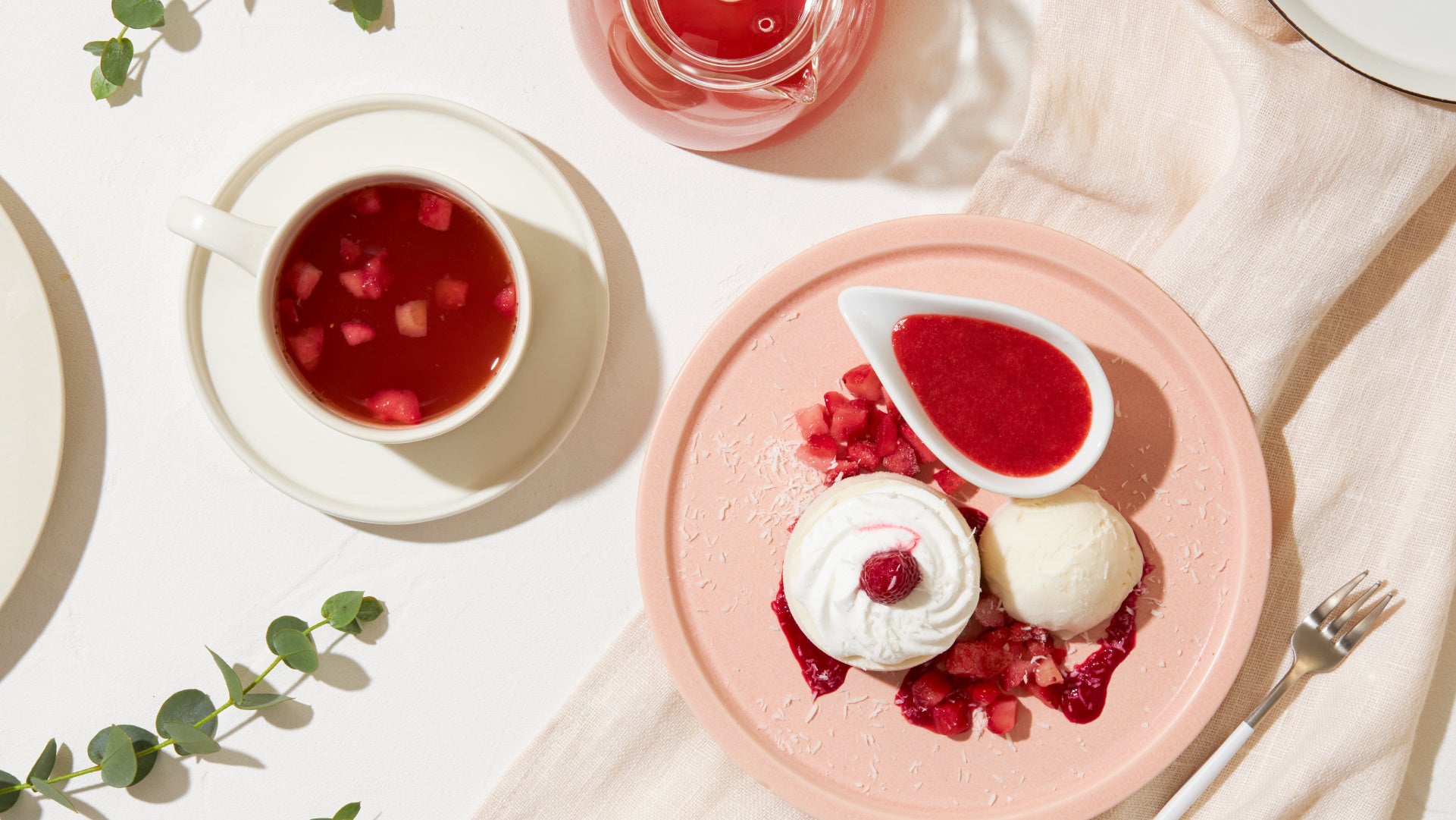 白の世界観のアクセントにストロベリーやトマトソースなどの赤の色味をプラスすることで、上品さの中にもちょっとしたご褒美感や、クリスマスシーズンならではの“ワクワク感”を感じられるようにしています。