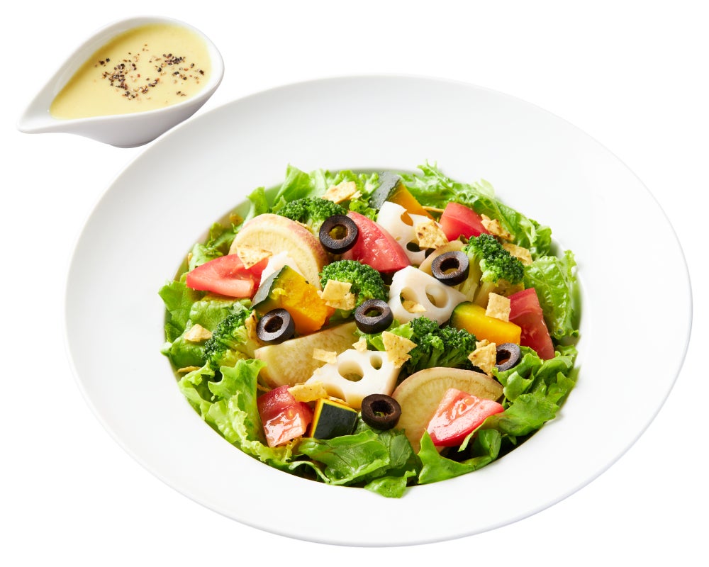 トマトやブロッコリー、かぼちゃなどの緑黄色野菜と、さつまいも、れんこんなどの根菜、1食で1日に必要な1/2の野菜量※8が摂れる具沢山サラダ。 アクセントとして、ザクザク食感のトルティーヤチップスをトッピングしています。 濃厚な味わいのオリジナルシーザーソースとの相性も抜群です。
