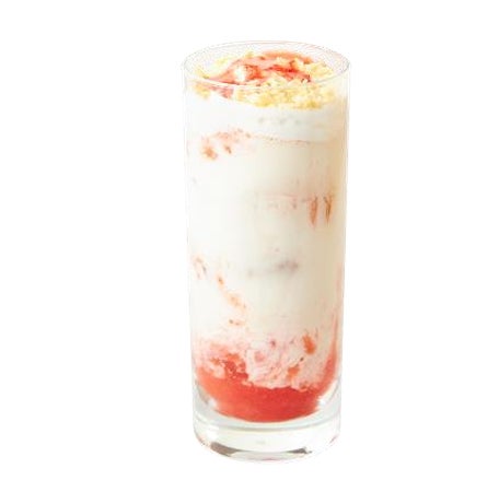 具材感のあるいちごソースを加えることで、果実味をプラス。アクセントに加えたアーモンドシロップのやさしい甘み、桃や杏を思わせる風味が、和紅茶の香りを引き立てます。いちごダイス入りで見た目も楽しい一品です。
