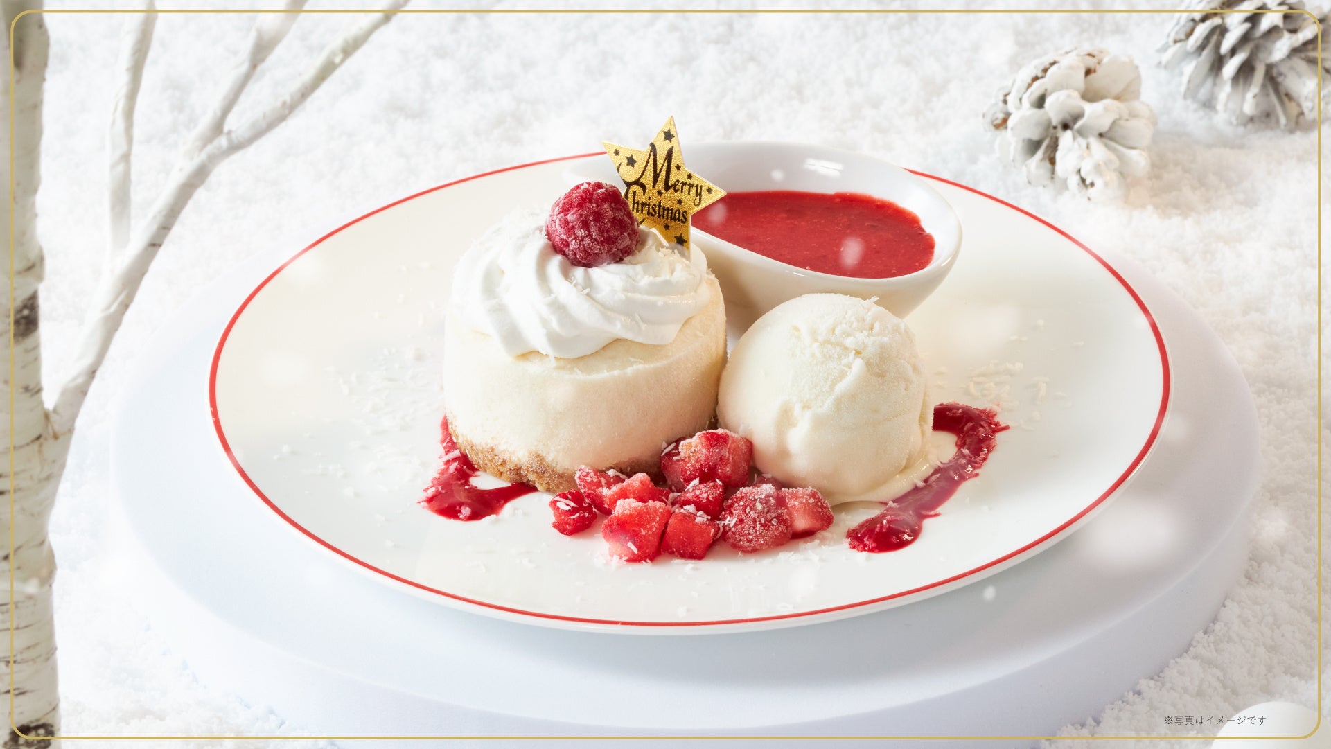 濃密レアチーズケーキの上に、植物由来のホイップとラズベリーをのせた冬季限定スイーツプレート。芳醇なバニラの香り広がるオリジナルの植物由来アイス「Melty Iceバニラ」に、具材感のあるストロベリーソースをたっぷりと添えています。 スイーツの濃厚でクリーミーな味わいと、ソースの程よい酸味のバランスが絶妙。ケーキの王道、ショートケーキに見立てた濃密レアチーズケーキにココナッツファインを粉雪のようにふりかけることでクリスマスムードを演出。ちょっと贅沢な冬のご褒美スイーツです。
