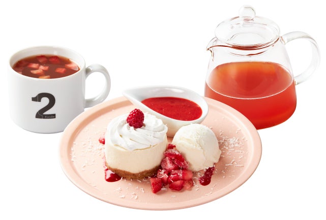 2foods人気のスイーツ2種を贅沢に味わえる「濃密レアチーズケーキのスイーツプレート ストロベリーソース添え」と、「和紅茶といちごのフレーバーティー」をアフタヌーンティーセットでお楽しみいただけます。