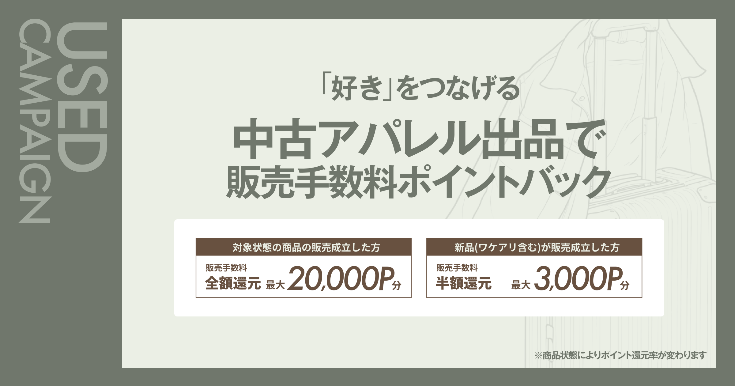 上記期間中にエントリーのうえ、中古アパレル商品を出品し、取引が成立した方の販売手数料の全額もしくは半額分をポイント還元します。 ※ポイント還元率は商品状態によって異なります |