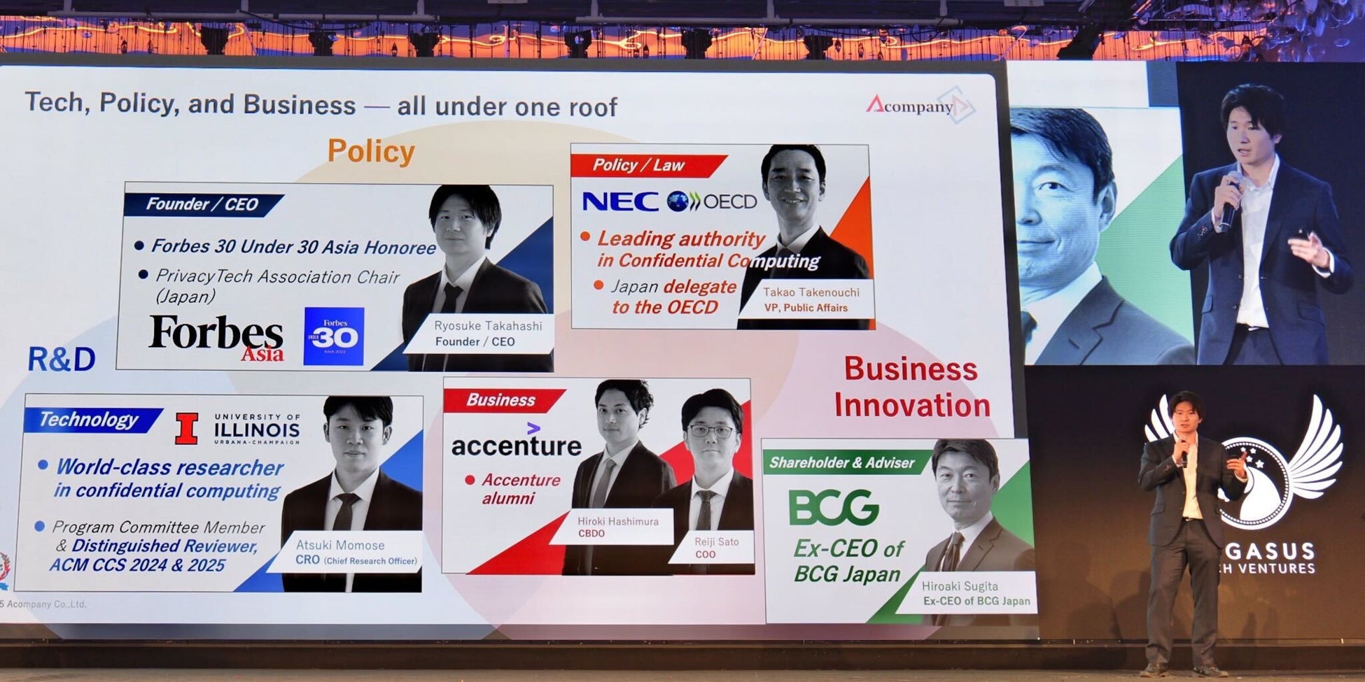 10月15日(水)に開催された準決勝戦には、世界各国から予選を勝ち抜いた強豪スタートアップが集結し、自社の優れた技術やプロダクトのピッチを行いました。日本からは、九州予選代表のトイメディカル株式会社、東京予選代表の株式会社Acompany、東北予選代表のAZUL Energy株式会社の計3社が決勝戦への出場をかけて、ステージに挑みました。その中でも、東京予選代表の株式会社Acompanyは、見事並み居る強豪を抑え、最終ファイナリスト10社に選出され、ファイナルステージでピッチを披露しました。同社は、暗号化されたままの企業の機密情報データを安全に保護しながら生成AI等で利用できる技術を提供しており、世界中の企業が生成AIの利用において抱えるデータ保護とAIセキュリティの課題を解決する効果的のソリューションとして、世界の舞台で高く評価されました。