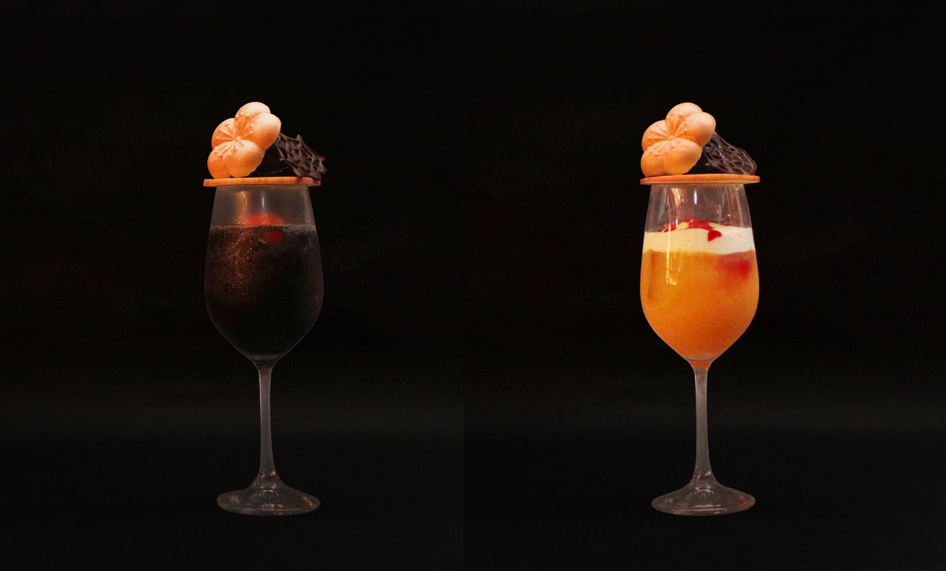 共にフローズン完熟南高梅1粒入りで、グラスの上にはリンゴスライス、黒ゴマアイスをトッピング、さらにハロウィンイメージのチョコレートと梅最中を飾りました。